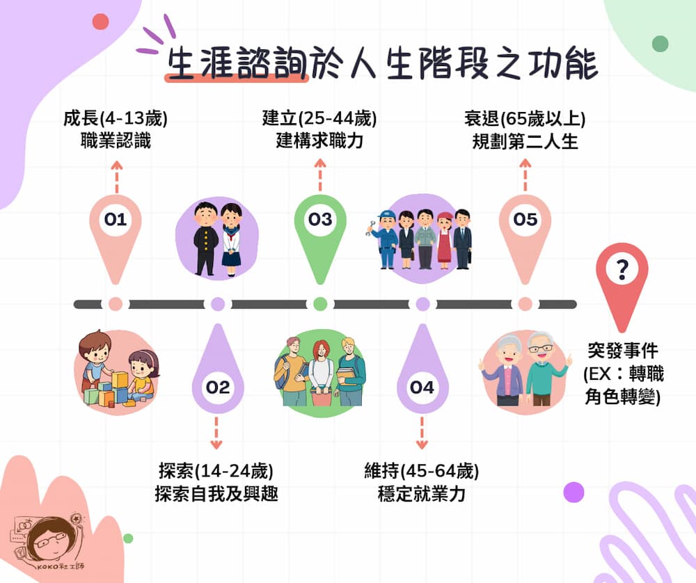 找尋生涯諮詢的實習個案時,個案問了一句「我已經畢業很久了,還需要諮詢嗎?」需要呀!其實根據SUPER的生涯發展階段理論,在人生的五階段中,依據各階段不同的發展和需求,都有生涯諮詢介入及發揮功能的部分。
