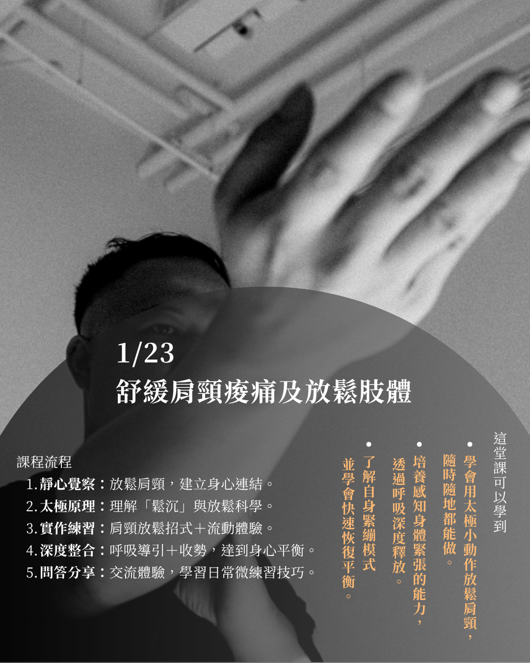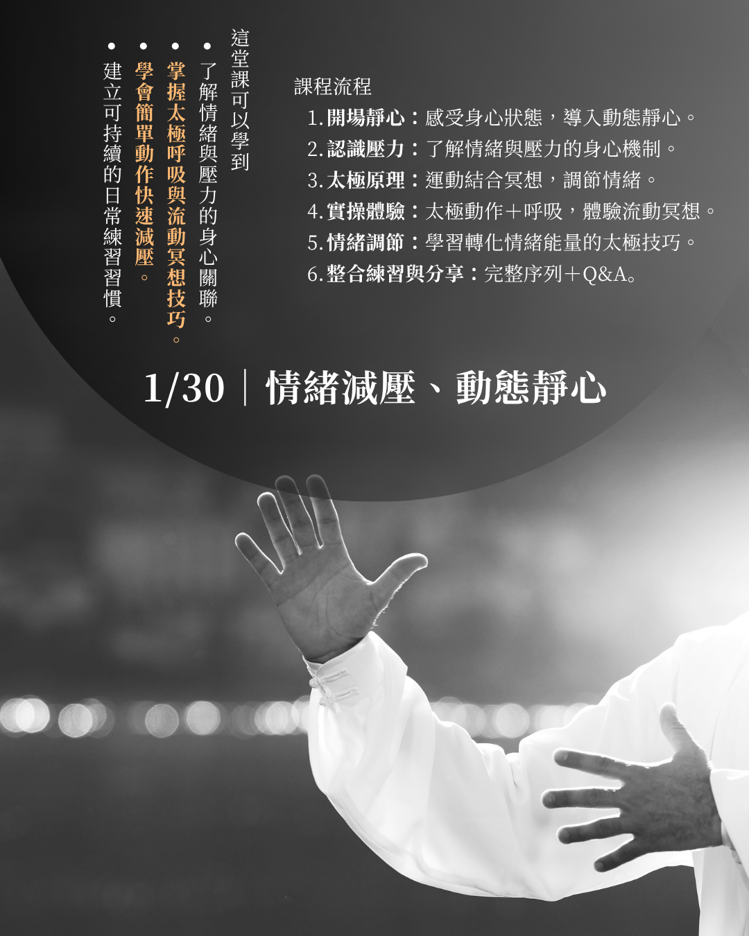 - 實操體驗:太極動作+呼吸,體驗流動冥想。