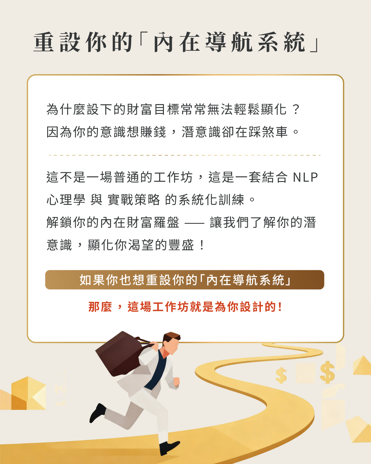 - 徹底轉化: 運用 NLP 技術,將負面信念重新框架為賦能你的全新財富觀。