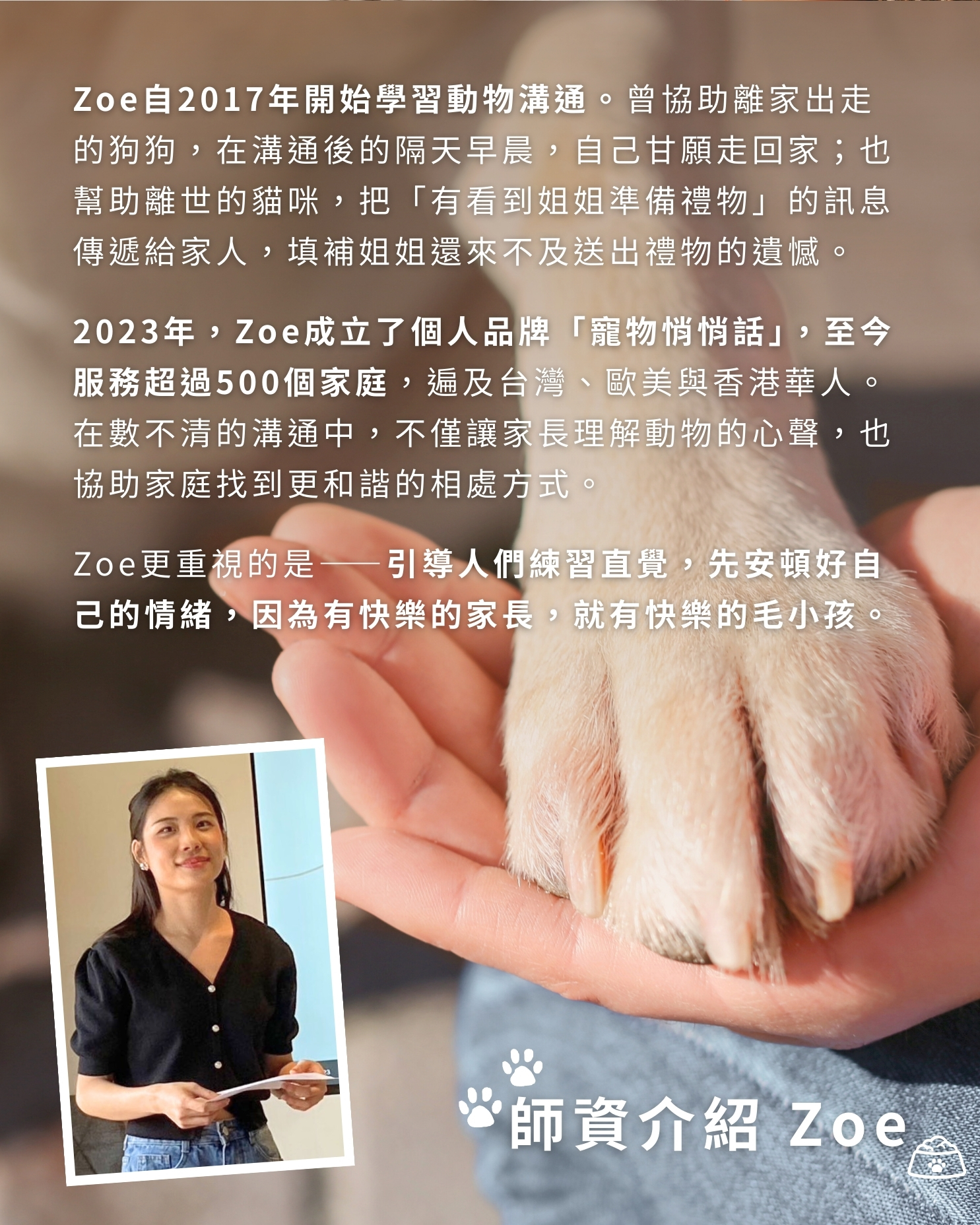 2023年,Zoe成立了個人品牌 「寵物悄悄話」,至今服務超過500個家庭,遍及台灣、歐美與香港華人。