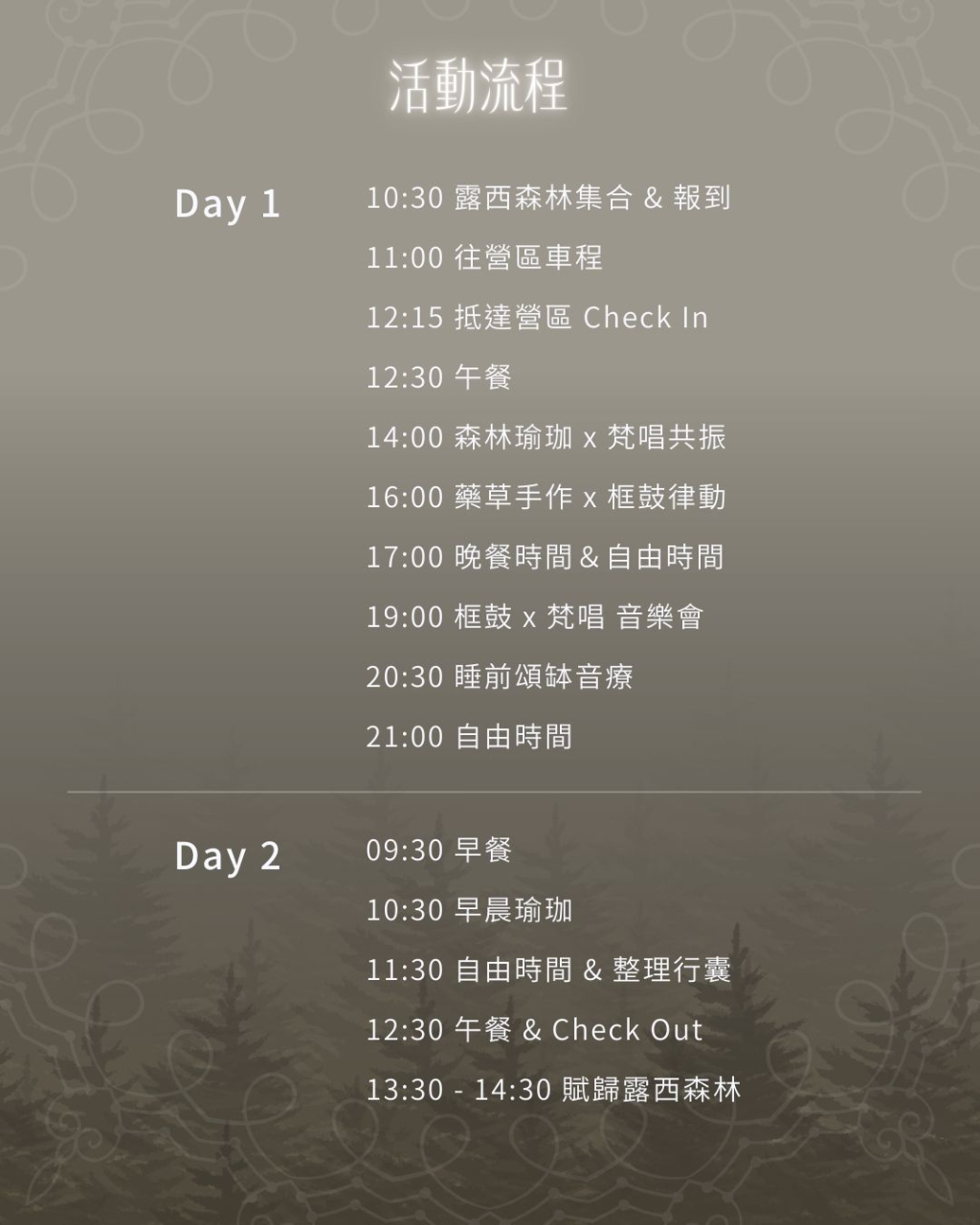 - 請攜帶舒適衣物(適合瑜珈伸展)、個人盥洗用品、瑜珈墊、水瓶、防蚊液、個人常備藥品。